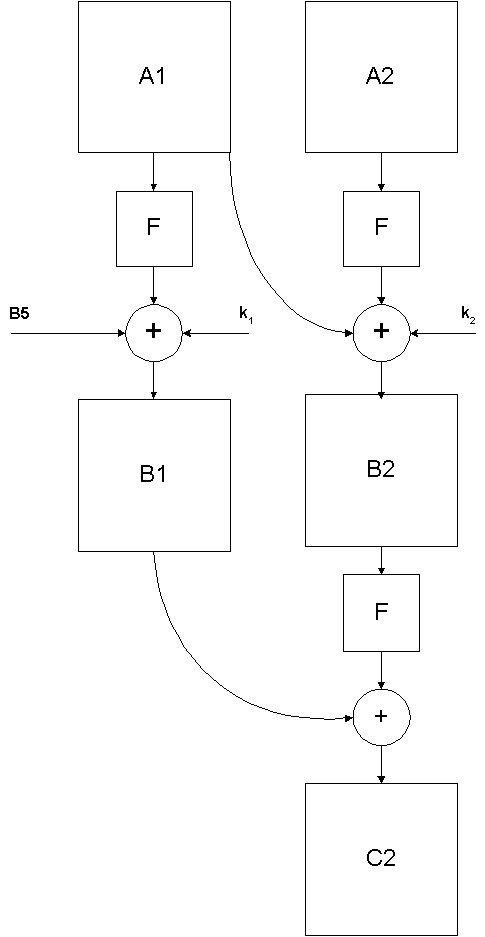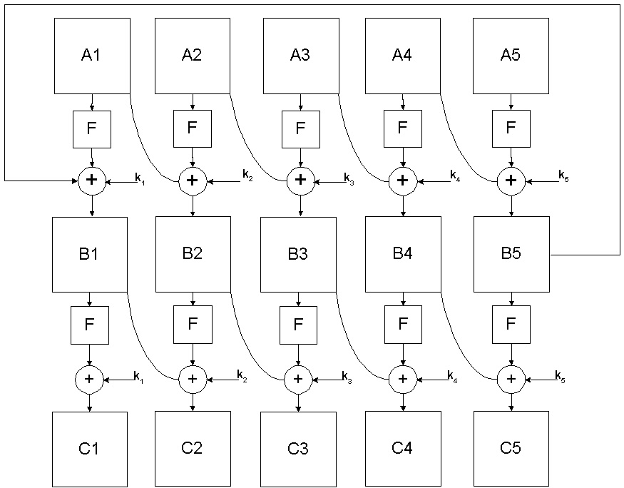 B(j) = XOR( F( A(j) ), A(j-1), kj) for j = { 2, 3, 4, 5 }