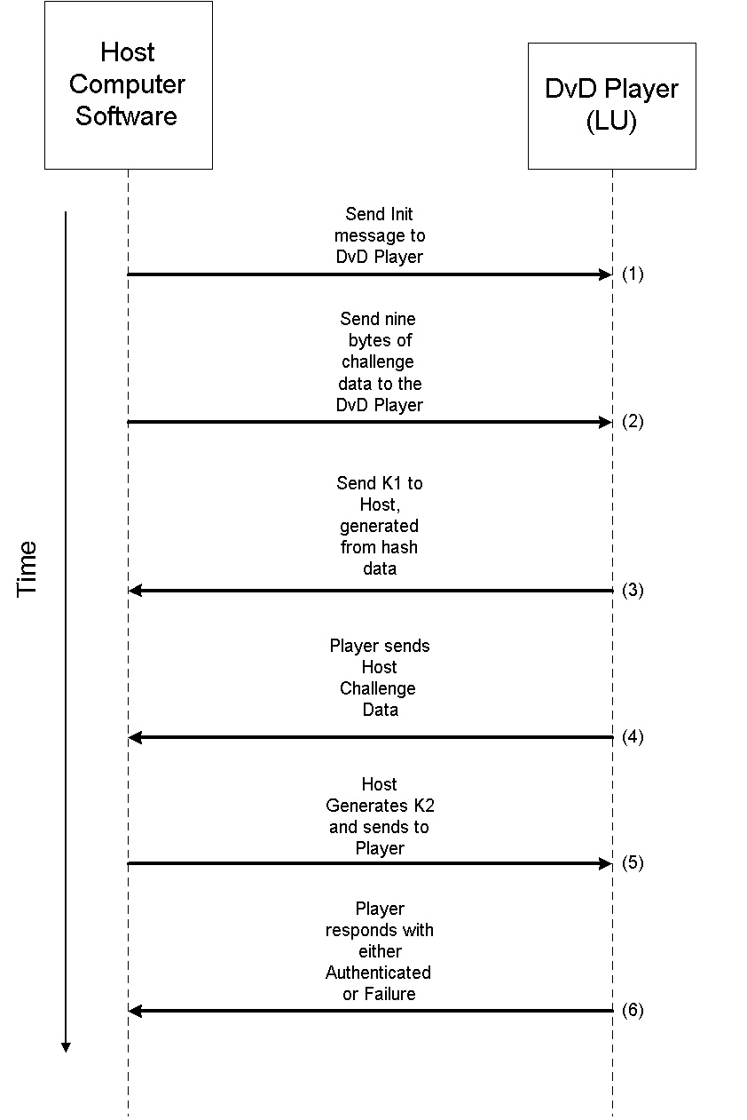 The authentication of the Host (Computer Software) to the Logical Unit (DvD Drive) is quite complex. As can be seen in Figure 4, there are six