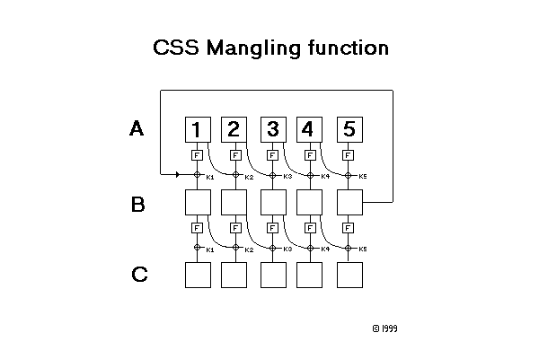 When the CSS streamcipher is used to encrypt keys such as in DA(data,key) and DB(data,key), an additional mangling step is performed on the data. This cipher is best illustrated with the following block diagram:The cipher is evaluated top down, with exceptions indicated by an arrow.