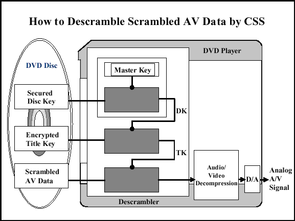 Decrypting a DVD movie is done in several steps, as shown in the figure above. First one must have a master key, which is unique to the DVD player manufacturer. It is also known as a player key. The player reads an encrypted disk key from the DVD, and uses its player key to decrypt the disk key. Then the player reads the encrypted title key for the file to be played. (The DVD will likely contain multiple files, typically 4 to 8, each with its own title key.) It uses the decrypted disk key (DK) to decrypt the title key. Finally, the decrypted title key, TK, is used to descramble the actual content.