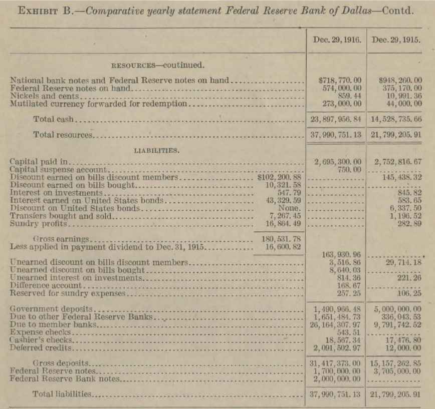 While Federal Reserve Banks were not organized for profit-a consideration always held to be subsidiary to the benefit of the system, and in no sense a test of its usefulness-it is gratifying to report that the Federal Reserve Bank of Dallas has made good headway in this respect, and has paid its members a dividend at the rate of 6 per cent per annum from the date of the capital stock payments, at the organization of the bank, to April30, 1916. On January 7, .1916, our board of directors declared a dividend at the rate of 6 per cent per annum from the opening of the bank to June 30, 1915, and on September 15 declared another dividend at the rate of 6 per cent per annum covering the operations to December 31, 1915. On November 28, 1916, the board declared a third dividend of 6 per cent per annum to and including April 30, 1916, payable December 30, 1916. Afer paying these dividends, there was sufficient margin left in the profit account to take care of any depreciation of furniture and fixtures, bank building, etc.