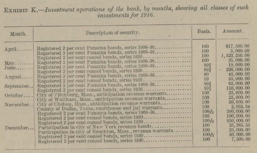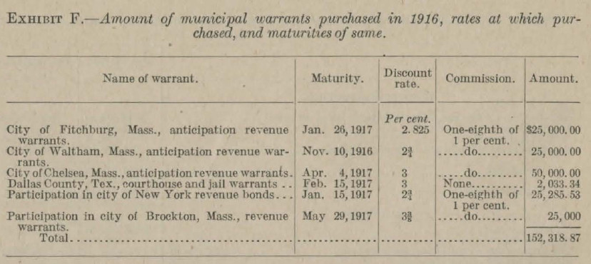 Investment in municipal warrants were on a limited scale, and during the past year purchases of such securities have amounted to only $152,318 at rates ranging from 3 to 3 3⁄8 per cent. Distribution by maturities and issuing authorities is shown in the Exhibit F attached.
