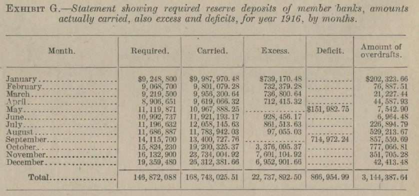 There is attached a statement (Exhibit G) showing the required reserve deposits of member banks, excesses carried, and amounts of overdrafts, by months, for the year 1916. The amount of such deposits on December 30 was $25,742,902.