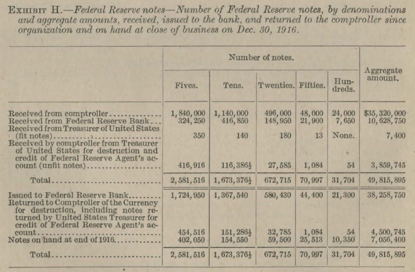In the attached table (Exhibit H) there are shown the denominations of Federal Reserve notes issued. Notes of the smaller denominations are in greater demand and, as the figures indicate, are issued in considerably larger number than notes of the higher denominations. The larger notes were used quite extensively during the past season in shipments to member banks to cover exchange drawn by their correspondents.