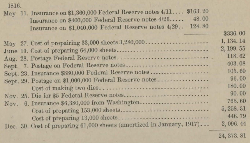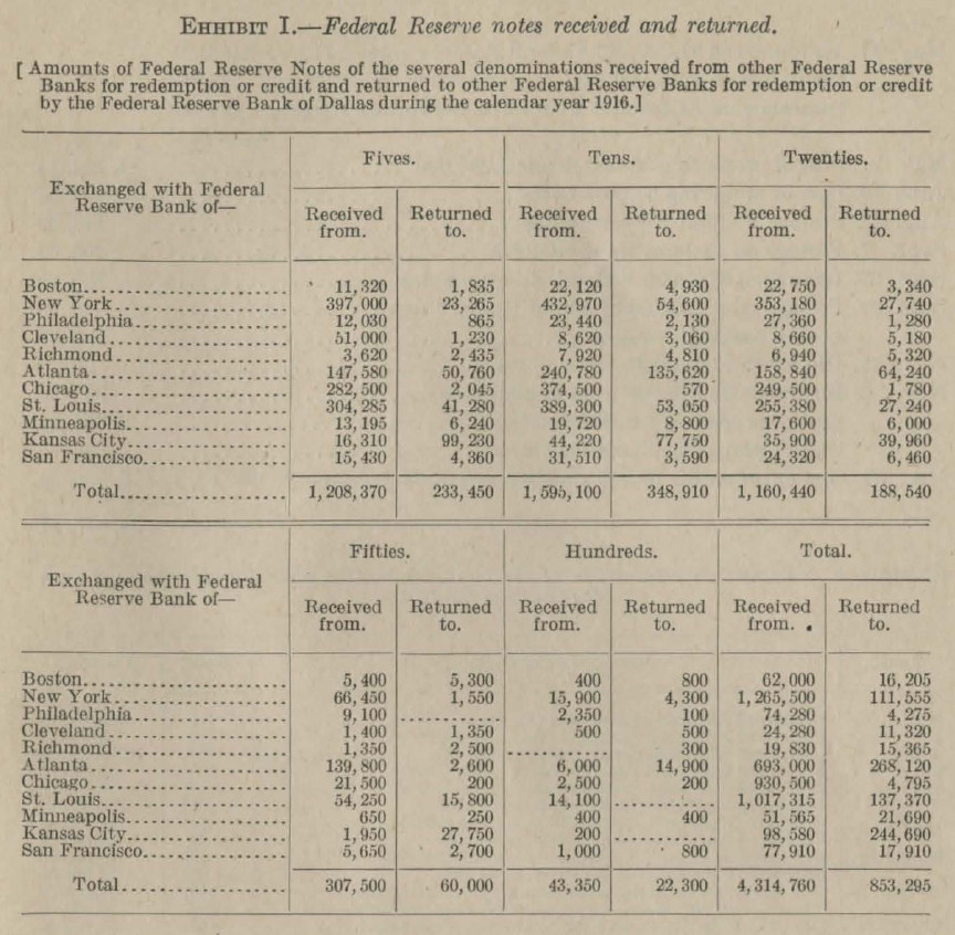 The movement of Federal Reserve notes between this bank and other Federal Reserve Banks is largely made up of notes returned to this bank. There have been returned by us in 1916 notes of other banks aggregating $853,295, while the amount of notes of this bank returned to us by other Federal Reserve Banks was $4,314,760. This will indicate the movement and show that approximately five times as many notes of this bank are received from other Federal Reserve Banks as are returned to the latter. On February 10 we issued a circular to member banks requesting them to separate Federal Reserve notes and send them to us against transfers to their northern and eastern correspondents instead of shipping the notes to make exchange. This action was taken on account of the very heavy expense to this bank for transportation charges. The circular had a good effect and resulted in a saving to this bank.