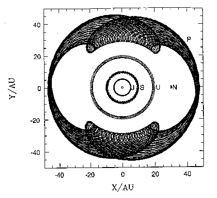Pluto and Neptune are in a well-known 3:2 resonance which prevents their collision or even any close approaches, regardless of their separation in the z-dimension. This figure shows the orbits of the four giant planets and Pluto in a reference frame rotating synchronously with Neptune's mean motion. The minimum Pluto-Neptune separation is 17 AU, compared to the minimum Pluto-Uranus separation of 11 AU. The libration of Pluto's orbit is due to an exchange of angular momentum with Neptune. When Pluto is "catching up" to Neptune, it gains angular momentum at Neptune's expense. Pluto moves into a higher orbit, but falls behind Neptune, since higher orbits have slower tangential velocities. Thousands of years later, as Neptune seems poised to overtake Pluto, the opposite exchange takes place. Pluto loses angular momentum, falling to a lower - but faster - heliocentric orbit.