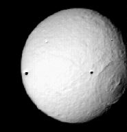 The second major feature seen on Tethys is a huge valley (called Ithaca Chasma) 100 km wide and 3 to 5 km deep which runs 2000 km or 3/4 of the way around Tethys' circumference (above).